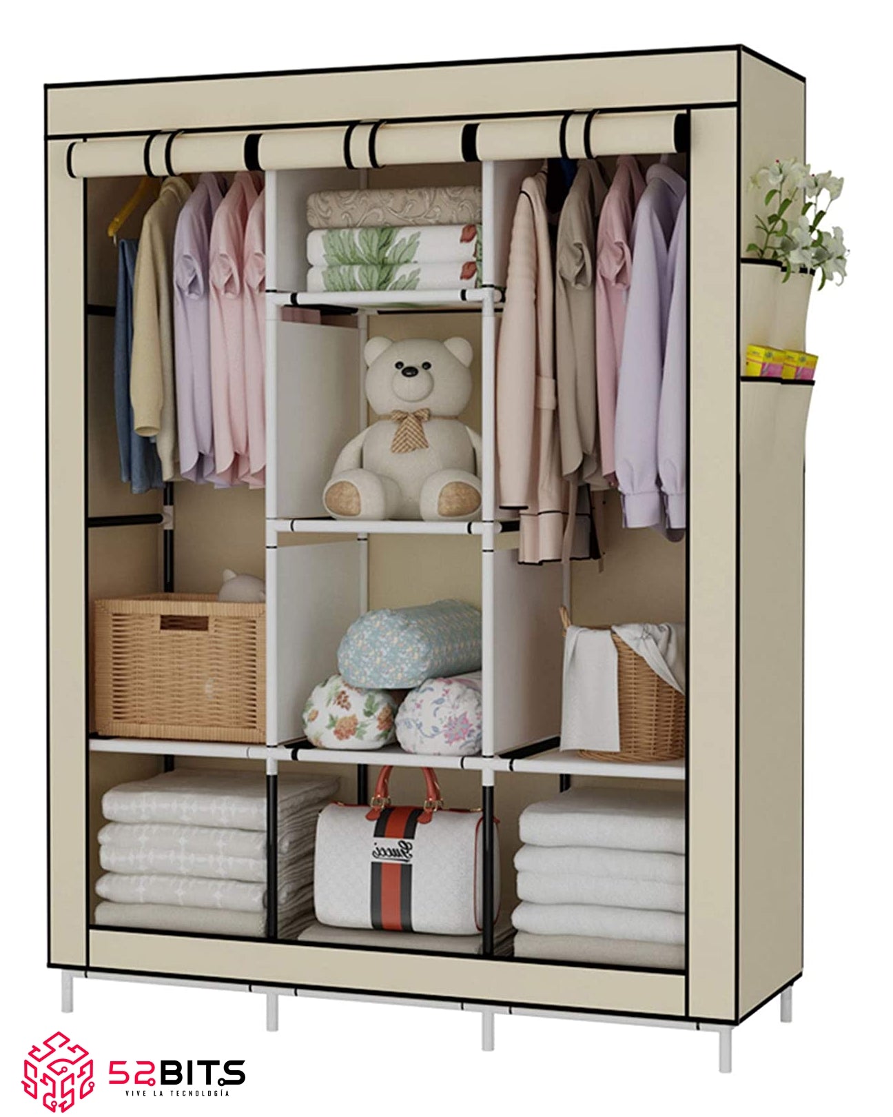 - Diseño Funcional: Incluye 2 barras para colgar ropa, 8 estantes y espacio para calzado.